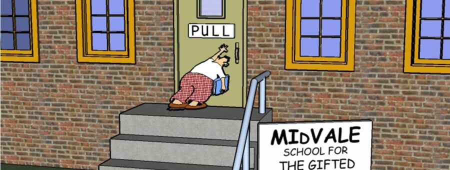 One of my favourite cartoonists of all time, Gary Larson, drew some marvellously politically incorrect pieces depicting some really stupid people. He drew one in which a chubby looking teenager tries to push a door that clearly says ‘pull’. At the entrance of the building is a sign saying ‘MIDVALE SCHOOL FOR THE GIFTED’. Yes, the ‘D’ is smaller, genius that Larson is!